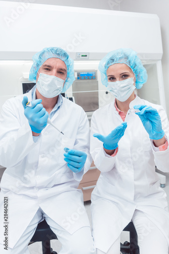 Scientists in biotech lab with pipette and sample dish