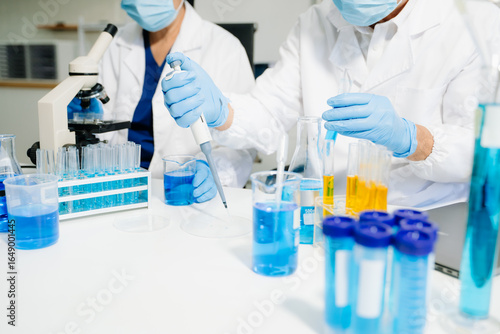 scientists in lab coats conducting research, handling glassware, and working with chemicals in a modern, high tech laboratory.