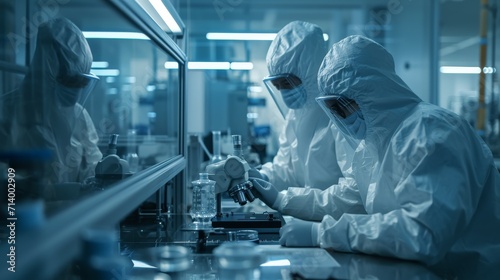 Scientists in Sterile Cleanroom Suits Control Manufacturing Machinery Work and Use Microscopes for Research, Doctors do tests in the laboratory.