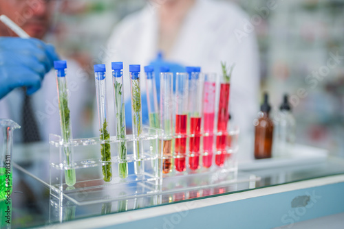 scientists perform experiments and record data. people arranges equipment with test tubes and chemicals for producing medicine and biochemistry. man hold tubes of chemical liquids and plant samples.