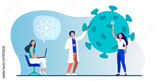 Scientists studying coronavirus. Team of experts doing medical research flat vector illustration. Virus, pandemic, science concept for banner, website design or landing web page