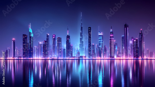 Sci-fi city skyline with olive and indigo neon lights. night scene with advanced skyscrapers. 3d render. Indigo Horizon. Illustration