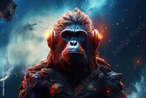 Sci-fi monkey wild animal, fantasy creature with colorful sky dark background. Generative Ai.