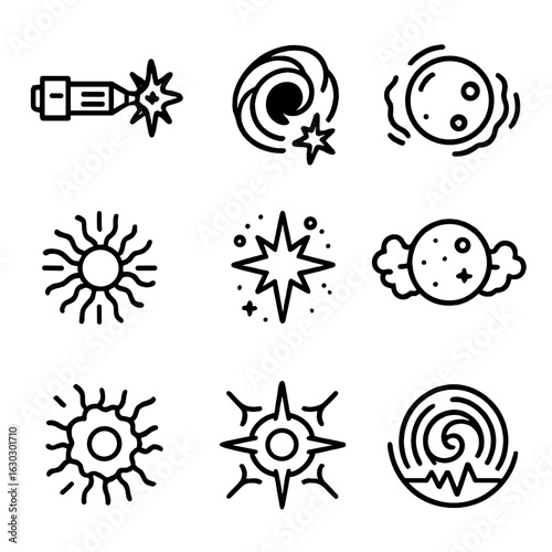 Sci-Fi Supernova Icons. Outline icon set of supernova in fiction: Star Trek nova bomb, Stargate supernova drive, Annihilation