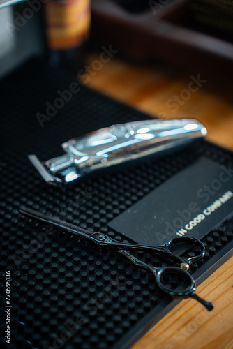 Scissor and clipper in barbeshop on dark rubber background