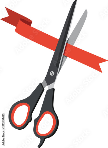 Scissors Cutting Red Ribbon Symbolizing Opening Ceremony Celebration Vector Illustration