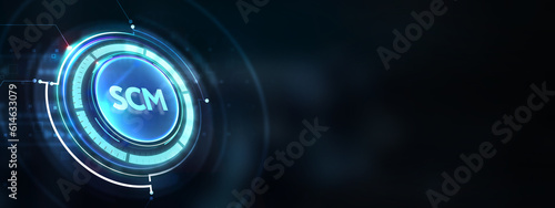 SCM - Supply Chain Management. Supply Chain Management SCM. Aspects of Modern Company Logistics Processes. 3d illustration