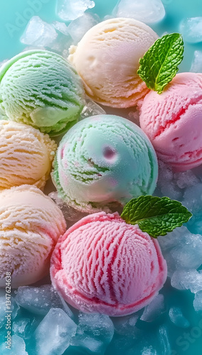 Scoops of colorful ice cream in pastel shades with mint leaves on crushed ice, close-up food background