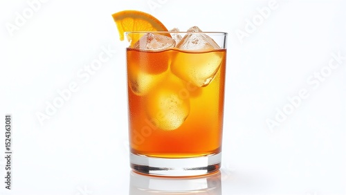 Scorpio cocktail in exotic orange tone, Garnished with citrus slice and ice, Photorealistic glass with droplets, Isolated on transparent background