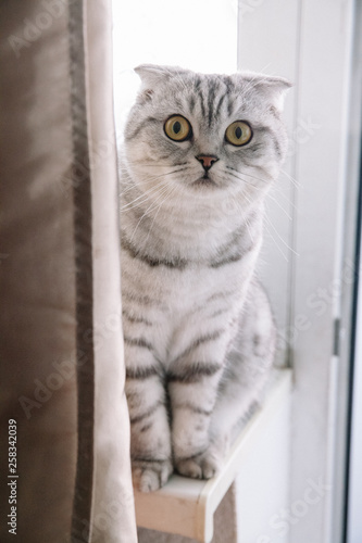 Scottish cat on the windowsill and looks up. Lop-eared cat with gray color