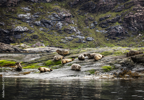 Scottish fur seals resting on coastal stones.