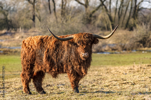 Scottish highland cows at the field at sunny winterday