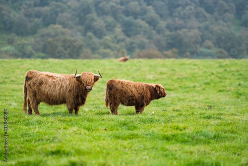 Scottish highlander hairy cow mother walks with her calf through the meadow. Nice bokeh backround.