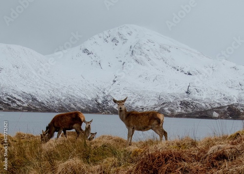 Scottish red stags in winter in the highlands near a body of water and snowy mountains