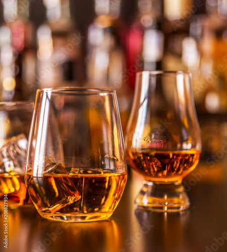 Scottish whisky in a glass with ice cubes, golden color whiskey