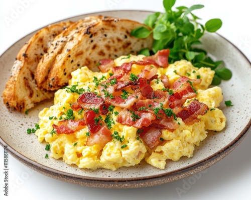 Scrambled eggs with crispy bacon and fresh herbs served on a plate, hearty breakfast, protein-rich meal, classic brunch dish, homemade comfort food