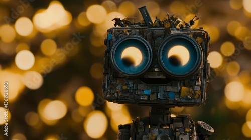 Scrap robot, glowing eyes, bokeh