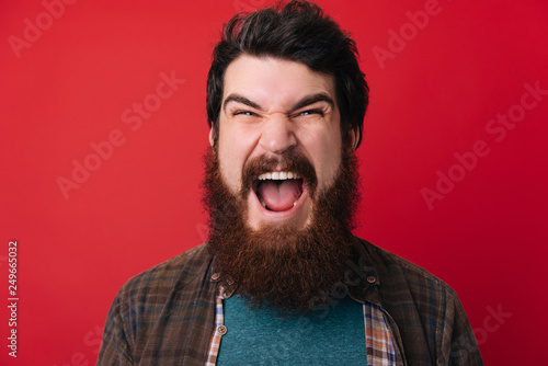 Screaming bearded brutal man and looking at the camera. Crazy man with beard
