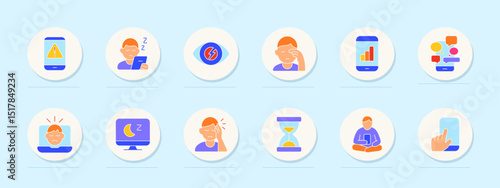 Screen addiction set icon. Phone alert, tired eyes, eye strain, fatigue, analytics overload, social flood, blue light, insomnia, headache, wait, meditation, swipe.