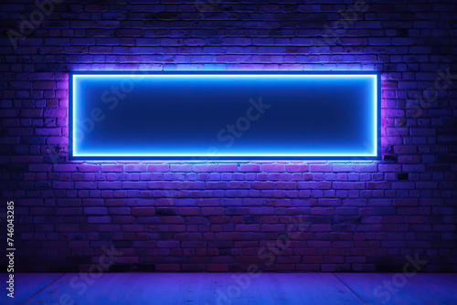 Screen on a brick wall with neon lighting. Generated by artificial intelligence