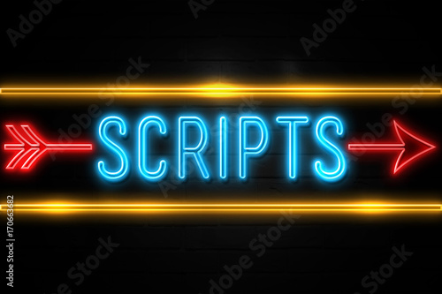 Scripts - fluorescent Neon Sign on brickwall Front view