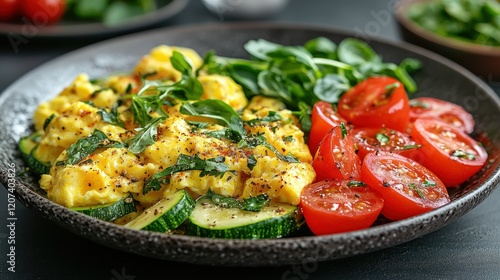 Scrumptious Breakfast: Scrambled Eggs with Zucchini, Tomatoes, and Herbs