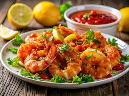 Scrumptious crispy shrimp plate: a gourmet seafood appetizer beautifully captured in appetizing photography.
