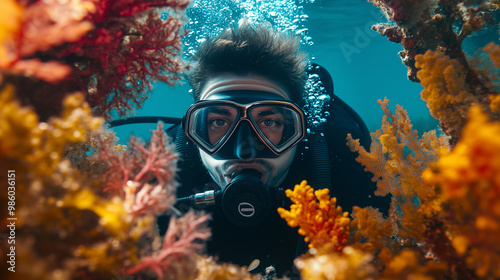 Scuba Diver Exploring Coral Reef with Vibrant Marine Life