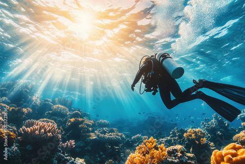 scuba diver exploring vibrant coral reefs underwater