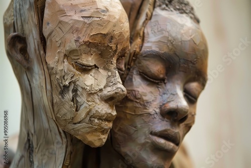 Sculpture depicting a woman and man with their eyes closed, symbolizing connection and trust, Honoring the authenticity of human connections in a sculpture