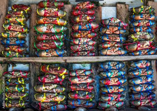 Scylla serrata. Fresh crabs are tied with colorful plastic ropes and arranged in a neat rows at the seafood market in Thailand. Raw materials for seafood restaurants concept.