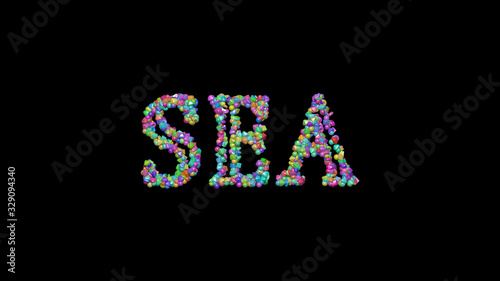 SEA: 3D illustration of the text made of small objects over a black background with shadows