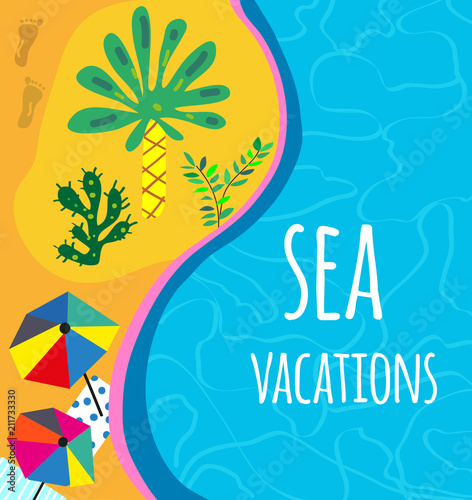 Sea and beach background for the vacation or party invitation, bright design. Vector graphic illustration