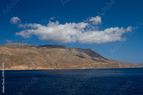 sea and the waves break on the rock and in the background is a mountain and clouds and a blue sky during the day