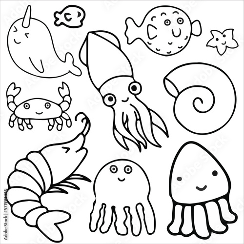 Sea animals doodle icon set vector illustration. Suitable for sticker pack, icon, logo and graphic design elements