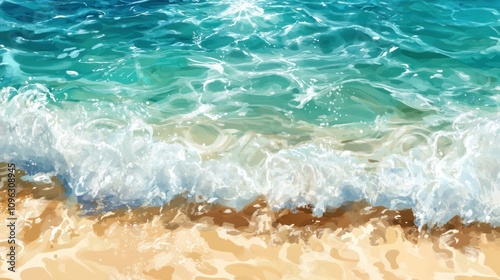 Sea background with clear turquoise water, a sandy seabed visible below, and sunlight sparkling on the waves