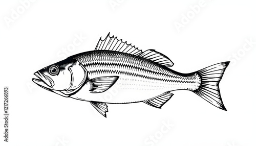 Sea bass, whole fish sketch isolated. Fishing, seafood concept. Hand drawn illustration in vintage engraving style, one line art, with white tones