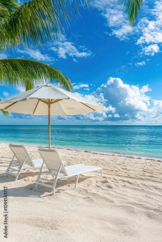 sea beach with two lounge chairs under an umbrella, palm tree, blue sea and sky on background