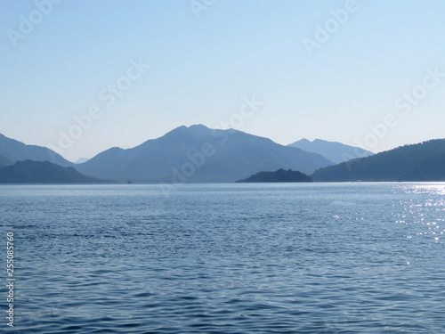 Sea coast in the morning, view from the ocean to the mountainous islands. Picturesque seascape, coastline with mountains and hills covered by forest, beautiful panorama