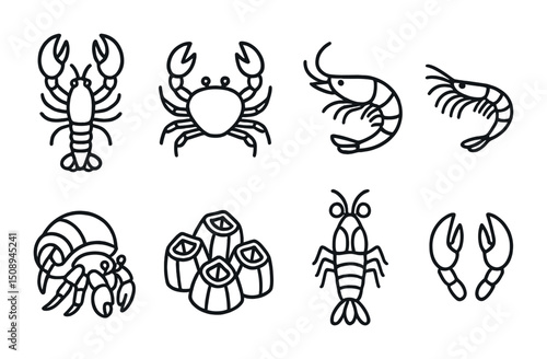 Sea creatures collection: lobster, crab, shrimp, and barnacle vector icons