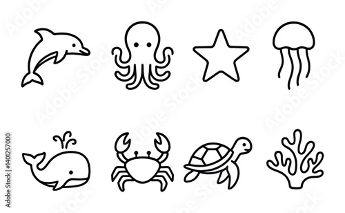 Sea creatures outline icons: dolphin, octopus, starfish, jellyfish, whale, crab, turtle, coral.