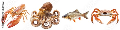 Sea creatures set isolated on transparent background PNG. Crayfish, lobster, fish, octopus