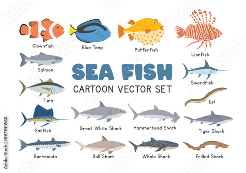 Sea fish vector illustration set. Marine fish cartoon clipart in flat style. Sharks, salmon, tuna, clownfish, blue tang, pufferfish, eel, swordfish, lionfish, barracuda, sailfish flat vector design