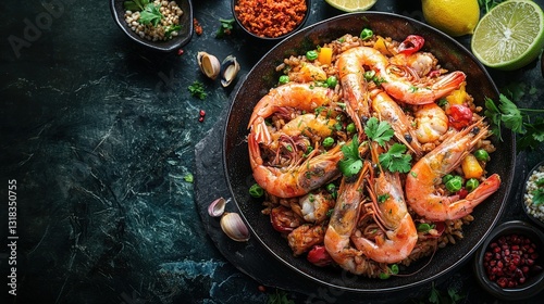 Sea food Piaparan Filipino Dish top view on a dark marble background