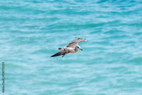 Sea gull in the clear blue sky.