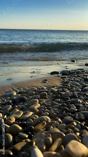 Sea rocks on the seashore. Blue sea and sand. A photo of the stones.