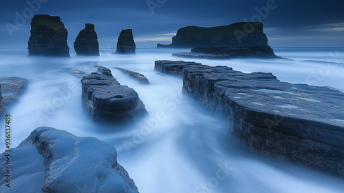 Sea Stacks at Dawn: A dramatic seascape with towering rock formations rising from the mist-shrouded ocean at dawn, capturing the ethereal beauty of nature's grandeur