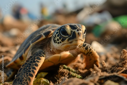Sea Turtle crawls toward sea. Plastic debris is scattered in the background