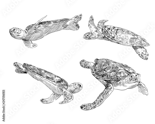 Sea turtle from a different angle hand drawn set. Vector illustration.