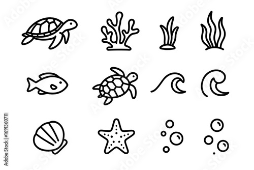 Sea Turtle Icon Set. Outline icon set of sea turtles swimming in their natural habitat: sea turtle, coral reef